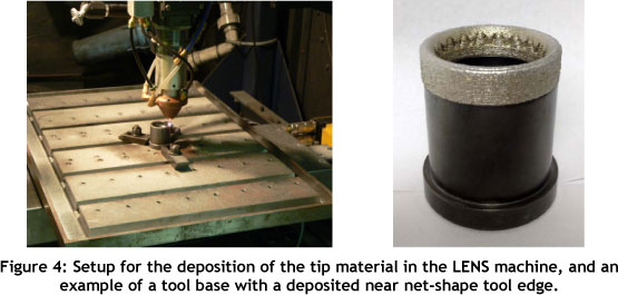 The new tool is made by hybrid manufacturing (see Figure 3). First, the tool base is made by machining in tool steel Orvar Supreme [15], which is heat treated to HRc 48. The edge material, CCW+ (a work hardening variety of Stellite), is added directly to the base piece using the LENS AM process. Again, the machining is carried out by a local toolmaker company; and the LENS AM is done by the South Dakota School of Mines and Technology in Rapid City, SD, USA, which has long experience with this technology. The hardness of cCw+ directly after deposition will be in the HRc mid-40s; but since this is a work hardening material, it will reach the required hardness with use. This case study is still in progress, and at the time of writing (January 2012), a set of tool bases had arrived from South Dakota after CCW+ deposition by LENS, and were being prepared for machining to final shape at a local toolmaker. There is no previous experience with the LENS deposition of this particular tool steel, so a series of primary deposition tests have been aimed at finding the correct parameters and verifying that no cracks are formed in the heat-affected zone. Since neither hardened tool steel nor CCW+ is favourable for machining, it has been made an objective to bring the LENS processing as close as possible to the final measurements (see Figure 4).