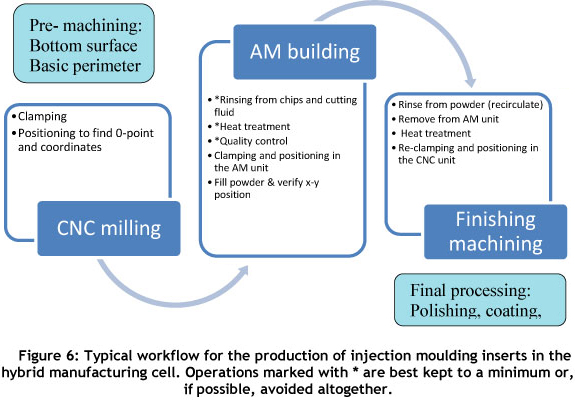The industrial case studies have shown that hybrid manufacturing can add substantial value to high performance parts. Still, conventional milling and AM building are two fundamentally different processes, with fundamentally different process requirements that- must be fulfilled before the work piece can enter the next process step. It has therefore been concluded that having the entire hybrid manufacturing process in a single machine would not be practical. A more flexible solution would be to integrate the workflow of two or more independent manufacturing machines into a hybrid manufacturing cell. The most beneficial combination of AMT and conventional manufacturing systems would depend on what type of products and product geometries are to be produced in the hybrid cell. From the clear benefits shown in the injection moulding case studies, the primary objective for the development of the hybrid cell would be tooling inserts for injection moulding.