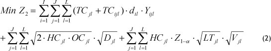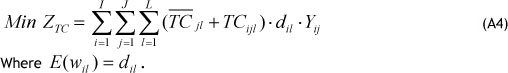 To calculate transportation costs, we replaced the distance component in the above objective function with the transportation cost in the whole network. Now we can formulate the transportation costs objective function, which is equivalent to: