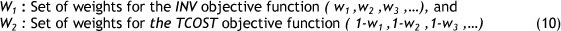 Solution Approach 3. In this approach, the objective function is TCOST and the other objectives (INV, TDELT) are added to the previous constraints (4)-(9). As in solution approach 2, it is important for DMs to consider Z1 and Z3 against the TCOST objective function.