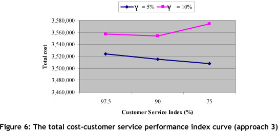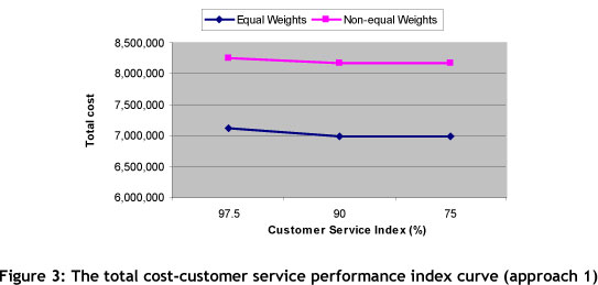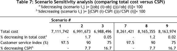 Note that in scenarios 5 and 6, although the customer service performance (90%, 75%) is lower than in the 4th scenario (97.5%), the objective function is higher. Therefore these scenarios are inferior and must be removed from the scenario list. Figure 3 shows the results of equal weights for scenarios 1, 2 and 3, comparing them with non-equal weights for scenarios 7, 8 and 9 in approach 1. A comparison of the first and third scenarios in Table 7 shows that total cost is increased slightly from 6,988,496 to 7,111,742 (1.7%) when CSPI is increased from 75% to 97.5% (23%). This situation is the same for scenarios 7, 8 and 9 in approach one and for the other scenarios in the second and the third approaches (Tables 9 and 11). As can be seen, the effect of customer service level decreasing on cost improvement is negligible. This may support management's preference to select K=97.5% because a large increase in CSPI results in a small cost penalty. Selecting the first or the seventh scenario in this approach is based on DMs' preferred objective weights.