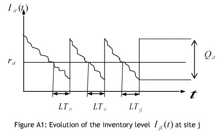 To calculate inventory holding costs at any located warehouse, we consider the continuous inventory revision [5]. In this inventory control policy, when the inventory level of product l falls below rjt , an order of Qjt units is triggered, which is received after LTjt time units. Figure A1 shows the stochastic demand pattern and warehouse fulfil rate. In this figure, the continuous line is the on-hand inventory, and the segmented line is the inventory position.