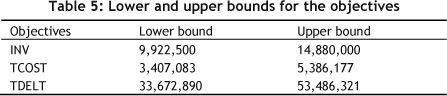 Considering the efficient extreme solutions given in Table 4, the lower and upper bounds of the objectives can be determined. In our case, the corresponding minimum and maximum values of the efficient extreme solutions are determined as the lower and upper bounds respectively, as presented in Table 5.