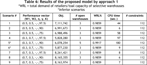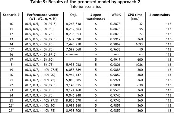 In Table 6, the warehouse load ratio percentage (WRL) column shows the efficiency of the opened warehouses. The average WRL in approach 1 is 0.9865, and since Zp1 is a non-linear objective function, the range of the CPU time for solving this problem is very wide, from 6 to 180 seconds.