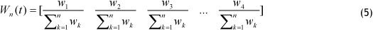 All FLRs could establish a fluctuation matrix based on the repetitiveness of each FLR in the historical data. Equation (4) represents a 1χη fluctuation matrix for a specific FLR, in which n denotes the number of fuzzy sets and w¡ 1<i<n indicates the frequency of that specific FLR with the right hand side of A¡ 1<i<n in the historical dataset.
