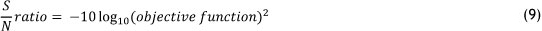 A transformation of the repetition data to another value is the measure of variation developed by Taguchi. Because of this transformation, which produces a signal-to-noise ratio (S/N), the Taguchi method is considered to be a robust design [32]. In this method, the terms 'signal' and 'noise' indicate the desirable value (response variable) and undesirable value (standard deviation) respectively. The method tends to maximise the signal-to-noise ratio.