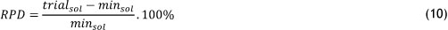 where minsol is the best result obtained for a given test problem among the experimental trials, and trialsol is the objective value (MSE) obtained in an experimental trial.