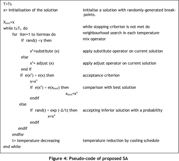 Simulated annealing (SA) is an optimisation heuristic that searches the solution space by generating a stochastic neighbourhood. In most heuristics, local optimality is a critical problem. The SA algorithm tries to overcome this problem by accepting bad solutions with a decreasing probability [27,28].