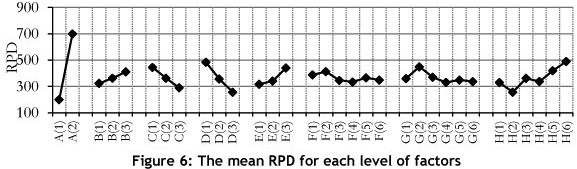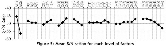 The results obtained for each experiment were transformed into a S/N ratio. Figure 4 shows the average S/N ratio for each level. As shown in Figure 5, A(1), B(1), C(3), D(3), E(1), H(2) are the optimum levels of factors A, B, C, D, E, H respectively. Determining the optimal level of factors F and G needs more investigation, for which, the RPD needs to be analysed.