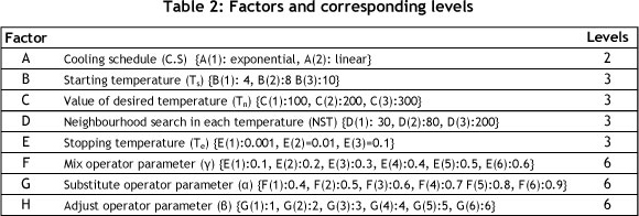 For this problem, eight factors are considered to be SA control factors: cooling schedule, starting temperature, stopping temperature, value of desired temperature, value of neighbourhood search in each temperature, substitute operator parameter (α), adjust operator parameter (β) and mix operator (y). Table 2 sets out the controllable factors and their related levels.
