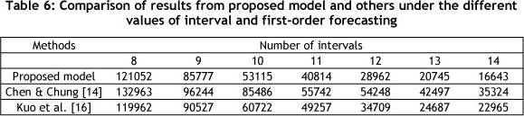 The proposed model was applied to the Alabama University enrolment data. A comparison of the results from the proposed model, from Kuo et al. [16], and from Chen & Chung [14], based on the different number of intervals and first-order forecasting, is shown in Table 6.