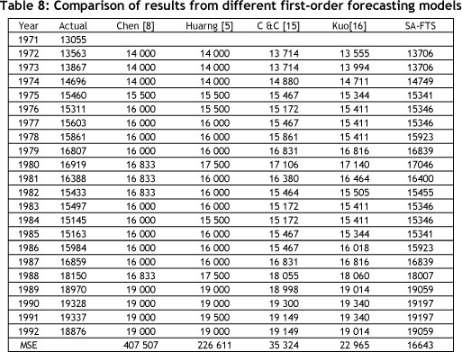 Table 8 contains a comparison of the forecasted enrolments generated by the proposed model and existing first-order fuzzy time series, with different number of intervals, such as Chen [8], Huarng [5], Chen & Chung [15] and Kuo et al. [16]. Three of the models - Chen & Chung [15], Kuo et al. [16], and the proposed model - used first order fuzzy forecast rules and 14 intervals to forecast enrolments.