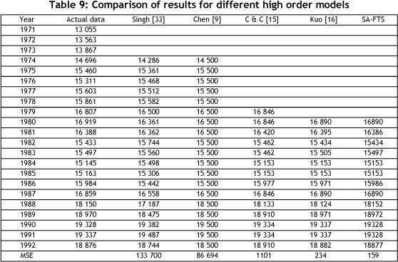 As the final step, the proposed model was compared with other high-order fuzzy forecasting models such as Chen [9], Singh [33], Chen & Chung [15], and Kuo et al. [16]. The results are shown in Table 9, where two of the models [15, 16] and the proposed model use ninth-order fuzzy rules and 14 intervals to forecast enrolments.