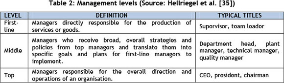 There are distinct levels within the management category, each playing a role in forming the culture. Hellriegel, Jackson and Slocum [35] differentiate between three levels of management: first-line managers, middle managers, and top managers. A summary of each of these levels, as well as a brief definition and list of typical job titles, is presented in Table 2.