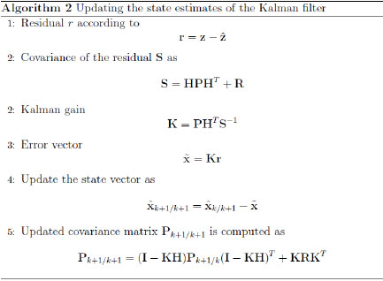 Assuming that propagated state estimate Xk/k, propagated covariance matrix estimate Pk/k+i, current measurement z, estimated measurement z , and the error measurement Jacobian matrix H are computed, then updated state estimate Xk/k+i is computed using Algorithm 2.