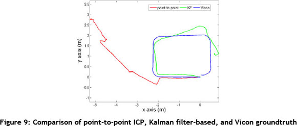 The fusion was implemented using point-to-point ICP, since it proved to be the most accurate one for our application. The transformation between IMU and ToF camera is estimated using the technical drawings of these sensors. The Kalman filter implementation was tested on an 8.7m long path, with an average linear velocity of 0.2 m/s and average angular velocity of 30°/s. The angular velocity is higher than in the previous experiment in order to show maximum improvement of Kalman filter. The trajectory estimations are shown in Figure 9.