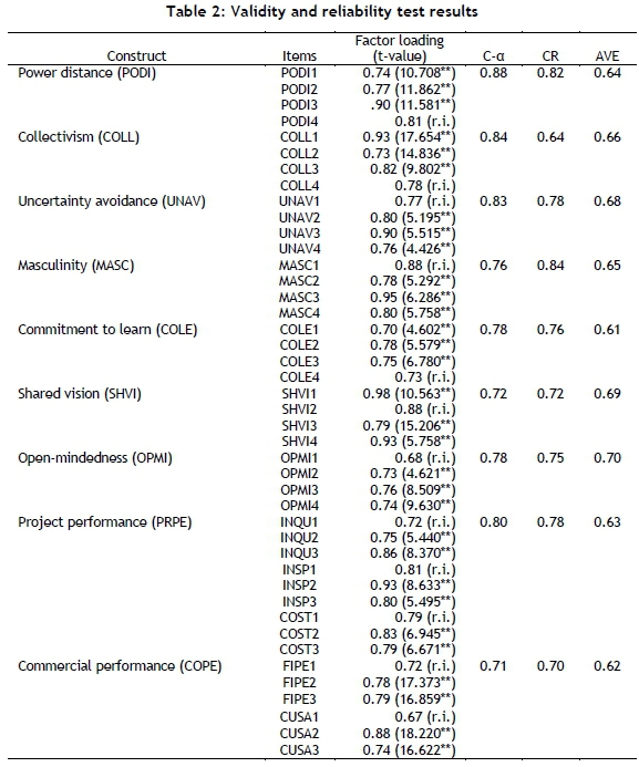 The hypothetical model considers Hofstede's four cultural dimension - power distance, collectivism vs. individualism, masculinity vs. femininity and uncertainty avoidance [6, 10] - as direct antecedents to organisational learning orientation, while product innovation performance was used in the analysis of the interactions. The total direct and indirect effect decomposition results provided in Table 3 indicate that all the interaction values are significant. The overall model explains 46 per cent of the variance with respect to project performance, and 60 per cent of variance in commercial performance.
