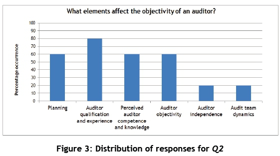 Furthermore, when the same participants are unable to agree on the value of implementing applied auditing methods to enhance auditor objectivity, it is probable that this very mindset impacts the application of consistent methods when formulating and evaluating audit findings. To test this view, a survey was completed to determine which elements were consistently considered, by all the participants, as part of the auditing process.