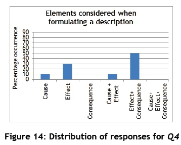 Figure 14 indicates that, when participants formulated an audit finding description, 50 per cent of them primarily considered a category that combined both 'effect and 'consequence', while 30 per cent of them considered only 'effect' and 10 per cent of them considered 'cause' and 'cause and effect' respectively.