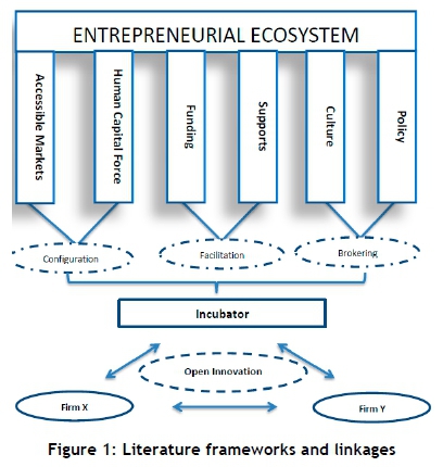 The literature base for this study is summarised in Figure 1. It shows the different streams in the literature, starting from the various 'pillars' of an ecosystem described by Isenberg [11]. These are accessible markets, human capital, funding, supports, culture, and policy. We look at how these pillars are translated to the actors and firms in the ecosystem via the incubator, using the open innovation framework.