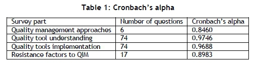 The degree of data reliability is measured using Cronbach's alpha, which is the most widely used measure to assess the internal consistency of the question scales used for data collection [11]. The reliability coefficient is considered acceptable if Cronbach's alpha is at 0.7 or more [24], [37], [38]. The dataset of the respondents was analysed using statistical techniques performed with the Minitab software package and MS Excel. The analyses were debated during a workshop held in the Saudi Quality Council (SQC), comparing the results with the second national survey, which was conducted at the end of 2015. It was attended by more than 25 different QM professionals. The survey targets the professional bodies related to quality management experience in the industrial area.