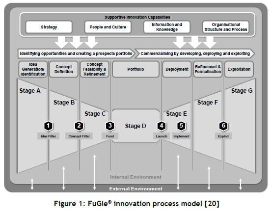 This paper is based on the FuGle® innovation process model, which was developed by Indutech [19] and is currently applied at the Industrial Engineering Department of Stellenbosch University. The purpose of this work is to enhance the FuGle® innovation process model in order to maintain competitive advantage for organisations by increasing the success rate of innovations.