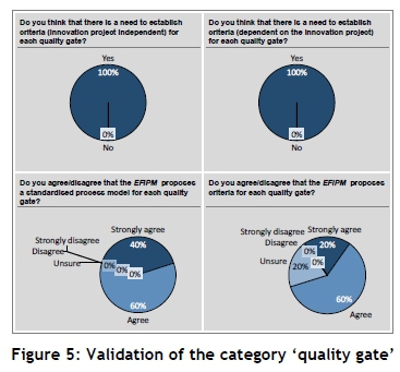 As illustrated in Figure 5, major consensus was achieved, confirming the need to establish general quality gate criteria that do not depend on the innovation project. General quality gate criteria have to be applied to all innovation projects. A further consensus was achieved: all participants thought that there is also a need to establish individualised criteria for each quality gate, depending on the corresponding innovation project.The participants agreed with the proposed standardised process to approach each quality gate. Eighty per cent of the interviewees agreed or even strongly agreed that the EFIPM should propose criteria for each quality gate. The remaining 20 per cent were unsure whether the EFIPM should propose quality gate criteria.