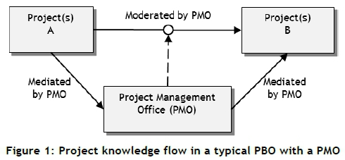 In a typical PBO with a PMO to direct projects, the PMO moderates and/or mediates the flow of knowledge between projects, as shown in Figure 1. Either (a) knowledge is transferred from one or more projects to the other(s) and the PMO moderates the process, or (b) project knowledge is transferred from project(s) to the PMO and then from the PMO to other projects. In the latter, the PMO acts like a knowledge repository; it manages the knowledge by determining what knowledge to transfer and when and how to transfer it to the respective project(s), depending on the needs of the receiving project(s).