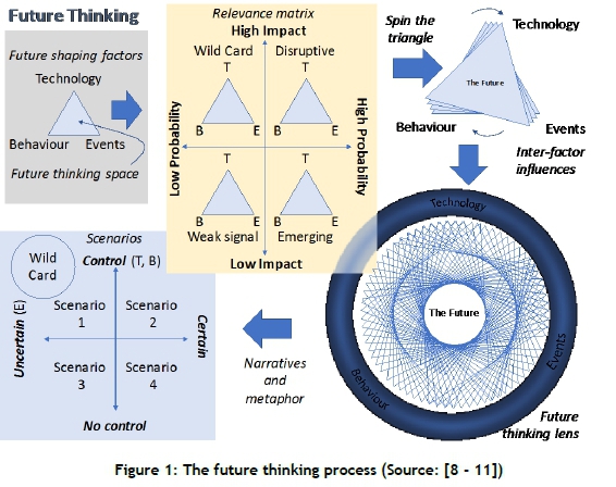 The future cannot be predicted, yet it is also not pre-determined. Future thinking is an integrated and holistic approach that looks at the future and what opportunity it holds [8-11]. It addresses four levels of futures: a possible future, a plausible future, a probable future, and a preferred future. It is aimed at strategic visioning, and includes the methodology of back-casting to determine strategic interventions in the present to manage the present from the future. Future thinking processes look at the future in the context of future shaping factors: technology (not science fiction, but technologies that are recognisable in the research and development phase); the behaviour of people (in the marketplace and workplace); and events that change the world (geopolitical events, natural events, economic events, and demographic and social shifts - predictable and unpredictable, avoidable and unavoidable). A triangle spanned by technology, behaviour, and events is drawn as a future thinking space (Figure 1 ). The relevance of the future-shaping factors is determined by their impact and probability; and the factors are categorised as emerging (high probability, low impact), disruptive (high probability, high impact), wild cards (low probability, high impact), and weak signals (low probability, low impact). This thought model is used to determine inter-factor influences that lead to scenarios of multiple futures. A preferred future can be selected, and a strategy can be shaped to reach that desired state in the future.