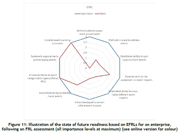 Figure 7 indicates EFRLs that are deemed necessary to become future ready. They address the ability to do event spotting, and to make sense of the emergence of these events. The ability to position business within the context of these events is critical.