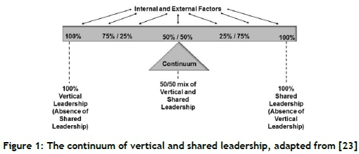 We define 100 per cent vertical leadership as the absence of shared leadership, and 100 per cent shared leadership as the state in which there is no vertical leadership. There could also be a 50/50 balance between the two leadership styles. Figure 1 illustrates the continuum between vertical and shared leadership. Internal and external factors could influence the balance between these two leadership styles, but that is beyond the scope of this study.