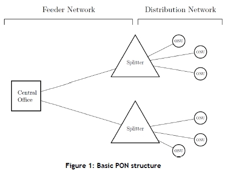 A PON implements a point-to-multipoint architecture, in which an optical splitter serves multiple optical network units (ONUs). ONUs convert optical signals to electrical signals, and are the equipment used by the customers to connect to the network. The central office (CO) contains optical line terminals (OLTs) that control the flow of information to the ONUs. The network has two parts: the feeder network, which connects the CO with all the optical splitters; and the distribution network, which connects the ONUs to optical splitters. The structure of a typical PON is provided in Figure 1. Optical splitters cannot be used as a switch, and they broadcast the same data to multiple ONUs. The main advantage of an optical splitter is the reduction in network deployment cost. Only a single fibre from the CO to the optical splitter is needed to connect multiple ONUs. Each optical splitter can serve a predetermined number of ONUs, usually by a power of two. Multiple optical splitter types may be placed at a single location. The common split ratios are 1:8, 1:16, 1:32, and 1:64.