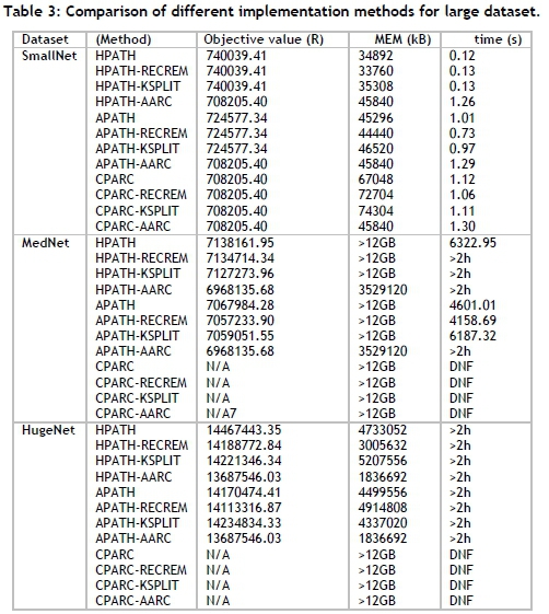 Table 3 shows the results obtained for the path-flow, arc-flow, and arc-path composite models respectively. Results are also reported when these formulations are solved with warm-start solutions obtained from the heuristic approaches RECREM and KSPLIT, or with the partial solution computed by solving the AARC formulation. Recall that the solutions obtained from solving the different ILP formulations may only be considered heuristic if AARC is not solved to optimality.