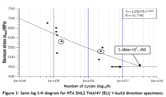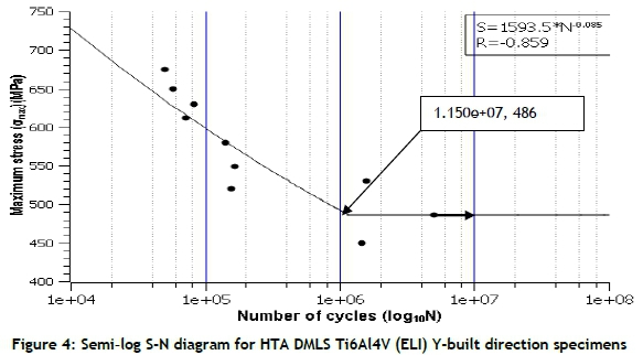 Figure 3 presents a semi-log curve of the maximum stress against the number of load cycles (S-N) of the Y-build direction DMLS Ti6Al4V (ELI) specimens.