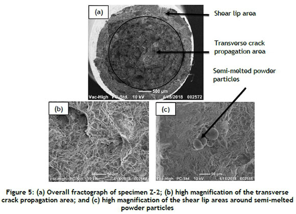 Figures 5 shows scanning electron microscope (SEM) secondary electron imaging (SEI) fractographs of the fractured HTA DMLS Ti6Al4V (ELI) tensile test specimens Z-2.