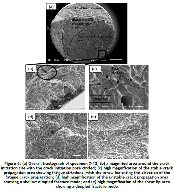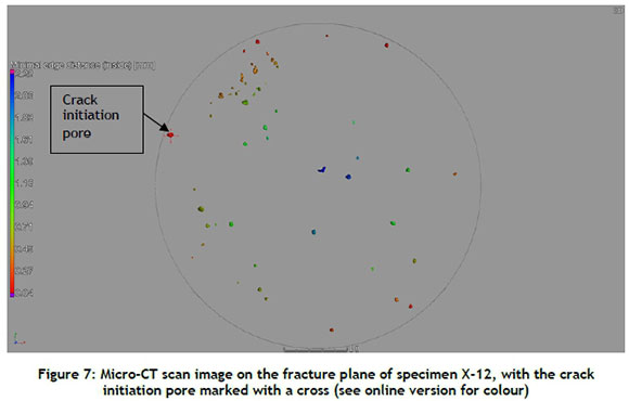 Figure 7 shows the micro-CT scan image on the fracture plane of specimen X-12, with the crack initiation pore indicated by a cross. This crack initiation pore had an area of 0.00433 mm2, resulting in a value of ΔΚ= 4.37 MPa m0.5.
