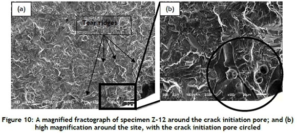 Figure 10 shows SEM SEI fractographs of specimen Z-12, which was cycled at a maximum stress of 520 MPa and fractured after 156,868 cycles.