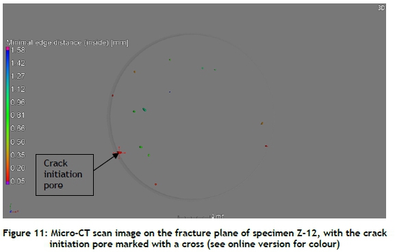 Figure 11 shows the micro-CT scan image on the fracture plane of specimen Z-12, with the crack initiation pore indicated by a cross. This crack initiation pore had an area of 0.01553 mm2, resulting in a value of ΔΚ= 6.02 MPa m0.5.