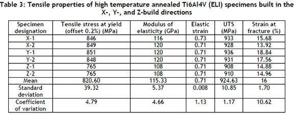 A summary of the tension test results of the HTA DMLS Ti6Al4V (ELI) specimens built in the X-, Y-, and Z-build directions respectively is presented in Table 3.