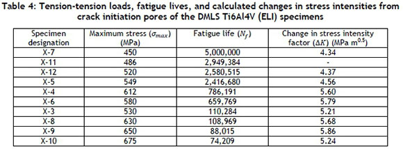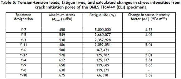Table 6 shows values of the maximum tension-tension fatigue stresses and the corresponding number of load cycles to failure or run-out of the test specimens. It also gives calculated values of ΔΚ from the DMLS process-related crack initiation pores of the respective specimens.