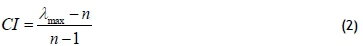 4. Check the consistency ratio (CR) to evaluate the pairwise comparison matrix. The pairwise comparison matrix will be available if its CR is less than 0.1. Brunelli [12] showed that the consistency ratio (CR) and consistency index (CI) can be calculated by equations (2) and (3).