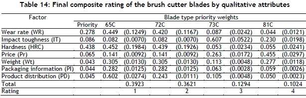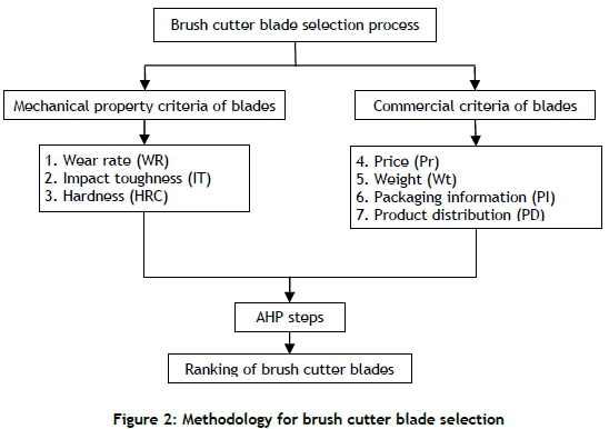 This research therefore aimed to analyse both the mechanical properties and the commercial data criteria for the buying decisions for replacement brush cutter blades, by using the analytic hierarchy procedure.