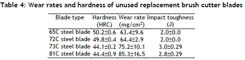 Four alternative blade types were selected, based on the survey results, as those four ranked the highest in purchaser selections. Typically, Thai farmers make their decisions to buy tools by following suggestions given by neighbouring farmers [3]. The decisions are not informed by data, but the suggestions are derived from real experience. In this investigation, the technical data of the select blades were examined in terms of hardness, wear, and toughness; the test results are shown in Table 4. The 65C steel blades had the highest average hardness of 50.2 HRC and the lowest average wear rate of 63.4 mg/cm2 (the best wear resistance). The average hardness and wear rate of 72C steel blades was not very different from those of the 65C steel blades. The average hardness decreased with increasing average wear rate (decreasing wear resistance), which matches the investigation of Gore and Gates [14]. The hardness and wear resistance had the following decreasing rank order of steel blades: 65C, 72C, 73C, and 81C. Higher wear resistance implies a longer service life [3], while hardness is also related to sharpness. Verhoeven et al. [15] found that high carbon steel, with high 61 HRC hardness, had a better cutting performance than low 41 HRC hardness. Conversely, the impact toughness of 65C and 72C steel blades is below those of 73C and 81C steel blades. The 73C steel blades had the highest toughness among the blades tested. Kwon et al. [2] used the impact test to predict the blades' response to collisions with a steel bar, following the test specifications for the Korean safety certificate. The impact toughness informed safety and reliability, which are requirements for high-speed products in foreign countries. The Korean safety certificate states that most of the tipped blades could not pass their safety testing [16]. The chips from blade tips that break off on impact with stones can seriously endanger humans.