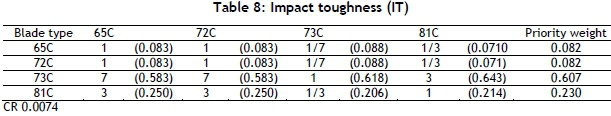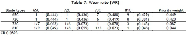 Table 6 presents the pairwise comparison of the blades with each of these criteria, which corresponds to the survey results in previous work [3]. In previous work, farmers considered sharpness as the first factor in the selection process, and service life as the second factor. Therefore, hardness positively correlating with sharpness has the highest importance. Wear rate is the next in importance, because it relates to service life. The impact toughness relates to safety and reliability, which are both important. However, the farmers considered this factor as the least important to them. Thus the importance of impact toughness is less than that of hardness and wear rate. The pairwise comparisons by each criterion in Table 6 reveal hardness as the most important criterion (priority=0.438), followed by wear rate (priority=0.278), and then impact toughness (priority=0.086). The values in parentheses were determined by step 5. The consistency ratio (CR) is calculated using eq. (3), which gives CR=0.079. This CR indicates that the data in Table 6 are available, as stated by Park et al. [5] and Saaty [7].