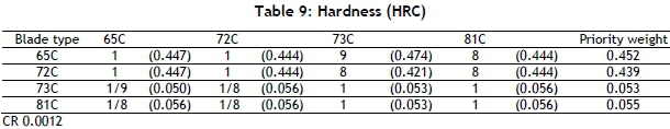 The scales for pairwise comparisons of the alternative blades by each criterion in Tables 7-13 are derived from the mechanical properties and the commercial data in the previous section. The values in parentheses were calculated using step 5. Considering each criterion, the 65C steel blade had the highest priority of 0.449 (Table 7), 0.452 (Table 9), and 0.602 (Table 13) for wear rate, hardness, and product distribution respectively. The 73C steel blade had the highest priority of 0.607 (Table 8) for impact toughness. The highest priority by price (Table 10) was 0.455 for the 81C steel blade. Both 65C and 72C steel blades had the highest priority of 0.305 (Table 11) for weight. The 72C steel blade also had the highest priority of 0.597 (Table 12) for product information. The results in Tables 7-13 are summarised in Table 14, in which the composite weight for each steel blade is determined. The best brush cutter blade type is the 65C, followed by 72C, 73C, and 81C, in that order. The best brush cutter blade found by AHP is consistent with the farmer survey results of Chucheep et al. [3]. In this survey, the farmers bought the brush cutter blades, considering sharpness first and service life second, using their own experience or word of mouth from their colleagues. In this work, the hardness and wear-rate criteria were related to sharpness and service life, with 65C and 72C having the highest hardness and wear resistance, but the 65C steel blade having better product distribution than the 72C.