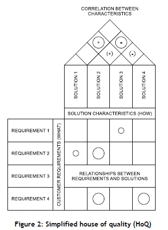 A modified HoQ is shown in Figure 2, where requirements are shown in rows and solutions are shown in columns. The relationships between requirements and solutions are shown as entries in the matrix, and correlations between possible solutions are shown in the triangle at the top. Clearly, one should endeavor to minimise correlation between solutions by selecting solutions that are independent and / or largely uncorrelated. Additional information not shown on the matrix includes weights associated with requirements and solutions, existing or competing solutions and their relevance to requirements, and the relative effectiveness of proposed solutions; these will not be used in this discussion for simplicity's sake. The HoQ matrix presented here has thus been contextualised specifically for research.