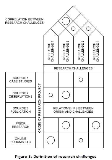 A clearly defined research problem, in the form of research challenges, is critical at the onset of a research project. Challenges should also be independent, as can be verified from the correlation between challenges shown in Figure 3 above. Validated research challenges will form the input to the following steps in the research process, and must thus be comprehensive and unambiguous. It is also necessary to show that research challenges have not been fully addressed by existing research, which may be shown by linking published research from a literature study to the proposed research challenges, using a relationship matrix.