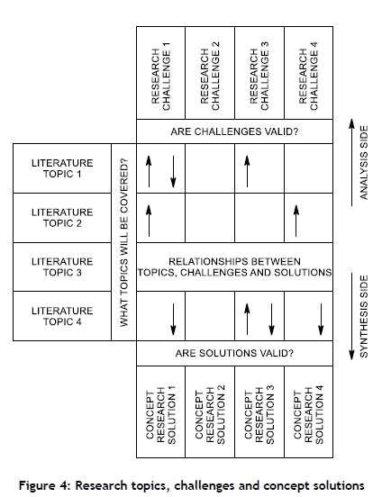 The matrix below (Figure 4) shows how a literature study informs both the analysis and the synthesis sides of the research process. Research topics are identified and arranged in the rows of the matrix. Arrows that point upward and downward show either that a literature topic (located in the rows of the matrix) verifies a research challenge at the top end of the matrix, or that a literature topic adds value to a concept solution at the bottom end. The direction of the arrow is thus used to show whether a topic confirms the challenge or informs a solution. Note that each research challenge at the top of a column is met by a matching concept solution at the bottom of that column.
