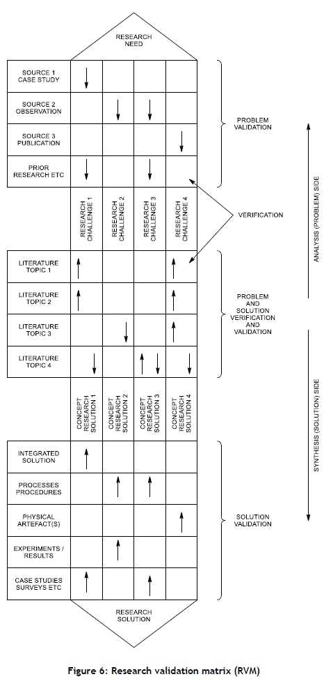 There is often disagreement about what is meant by 'research validation'. However, considering the matrices presented in the definition, analysis and synthesis phases, it is evident that a definition of 'research validation' lies in the combination of these matrices. A combined matrix, defined here as a research validation matrix (RVM), is shown in Figure 6. It is thus put forward that validation should be considered in an integrated manner, as follows: