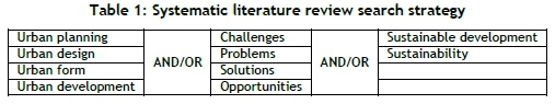 An SLR is a procedurally rigorous examination of research results [5]. The beginning of the project starts with a foundation of knowledge. The difference between a typical literature review and an SLR is found in the fundamental approach. An SLR follows a method that is set out before the review begins, and contains several steps, including extraction and synthesis. The SLR begins with a Boolean search, which refers to sifting through a large database of research articles using a group of synonyms for the theme under review (see Table 1). Next, the SLR method scrutinises the new group of research papers to ensure their relevance to the intended theme. See Figure 2 for the SLR search flowchart. Thereafter, the sustainable urban planning challenges are extracted from each paper; this is discussed further in Section 3. Lastly, the challenges are synthesised by tallying the number of challenges in each topic and conclude the SLR.